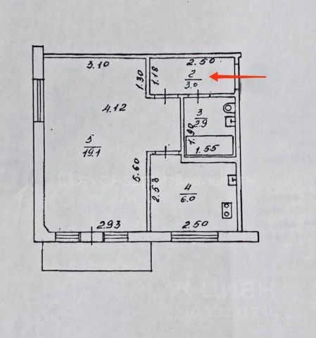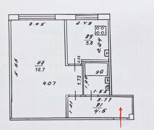 Планировка квартиры: кухня 11,0 м2 с выходом на остекленную полностью утепленную лоджию - 9,1 м2, спальня - 9,8 м2, санузел - 3,3 м2, прихожая - 5,1 м2.