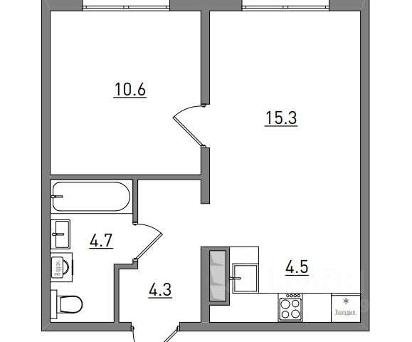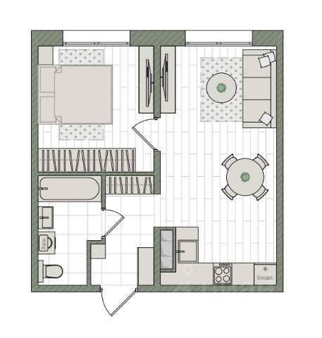 Планировка квартиры: кухня-гостиная -17,1 м2, спальня - 11,9 м2 с выходом на лоджию, прихожая - 6,8 м2, санузел-3,9 м2.