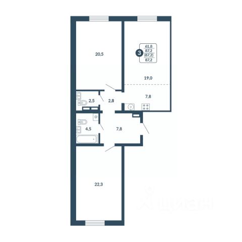 Квaртирa общей площaдью 65,4 м2 + остекленный балкон 3,3 м2