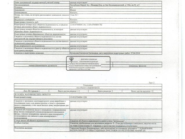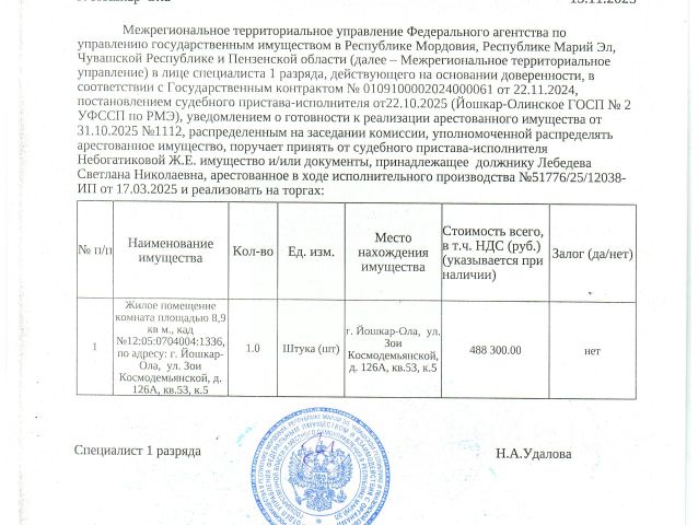 Данные получены с сайта ГИС Торги. Жилое помещение, комната площадью 8,9 кв м., кад 12:05:0704004:1336, расположенная по адресу: РМЭ, г. Йошкар-Ола, ул. Зои Космодемьянской, д. 126А, кв.53, к.5, должник Лебедева С.Н. (организатор торгов сведениями о зарегистрированных в жилом помещении лицах, информацией о задолженности должника по взносам на капитальный ремонт не располагает (судебным приставом-исполнителем не предоставлены).