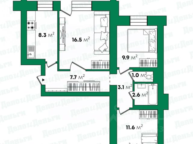 Квaртирa общей площaдью 71,5 м2 + остекленный балкон 3,8 м2