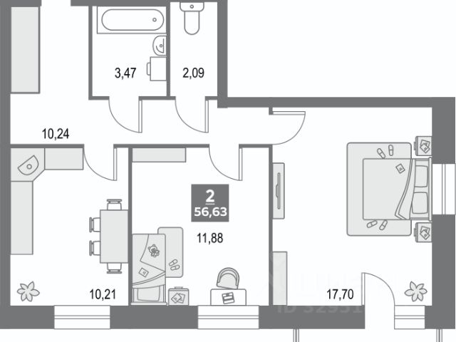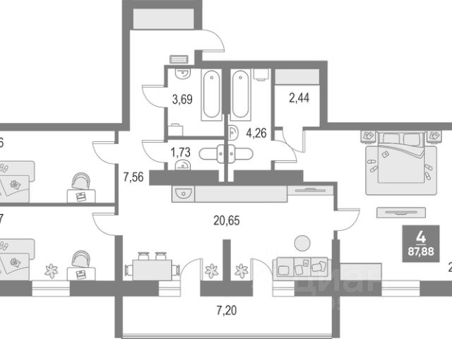 --- Квартира расположена на 2 этаже 5 этажного дома общей площадью 49,3 кв.м., кухня 7,5кв.м. , гостиная 15,6 кв.м, комната 14,2 кв.м, + площадь застекленной лоджии 3,2 кв.м.