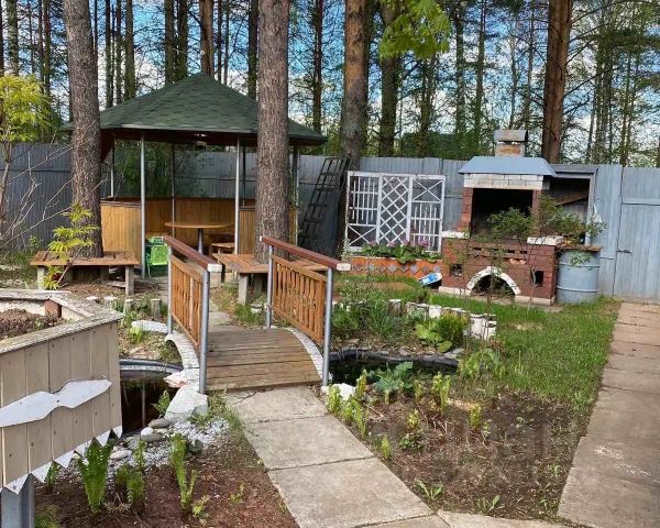 Участок правильной квадратной формы, ровный, сухой. Все постройки расположены продуманно и удобно. Летний водопровод проложен по участку для полива, установлено освещение. Большое количество насаждений: яблони, малина, смородина, крыжовник, клубника, декоративный виноград, цветы.
