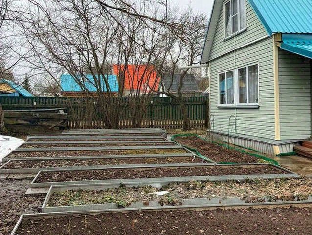 На участке установлены 2 крепкие теплицы под стекло, чугунные баки для воды, оформленные грядки,