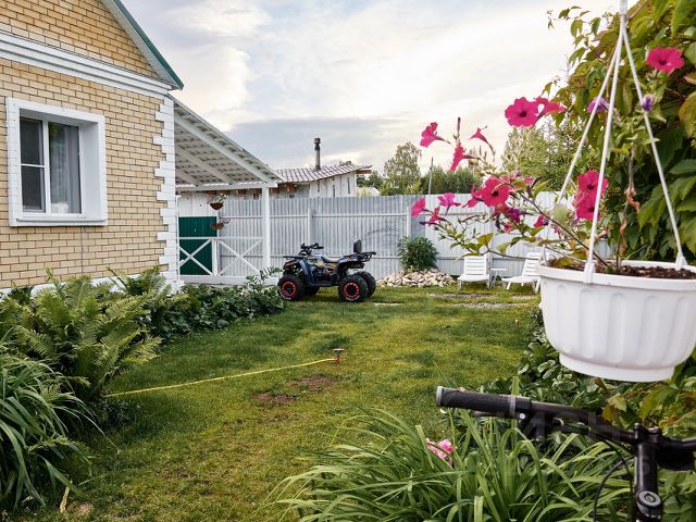 Земельный участок поделен на зоны: зона парковки, зона с рулонным газоном и автополивом, зона для сада и огорода. На участке есть отдельно стоящая постройка - чайный домик / винный погреб - 2 этажа (с подземным хранилищем). Участок огорожен забором, По красной линии 2 въезда с автоматическими воротами, 12 столбов из кирпича, смонтировано освещение. Забор из профнастила с дополнительными ребрами жесткости, окрашен с двух сторон. Территория перед домом отсыпана гравием.
