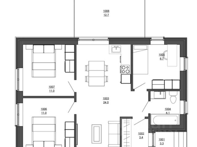 *Сруб из сосны 7х8, большая комната 26 кв м на 5 окон -имеется зонирование, маленькая комната- 6 кв м- вход с кухни,