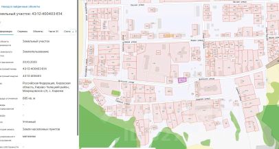 Земельный участок с кадастровым номером 43:12:400403:614. Площадь земельного участка - 685 кв.м. Разрешенное использование - магазины. Категория земель - земли населенных пунктов. Местоположение - Кировская область, Кирово-Чепец...