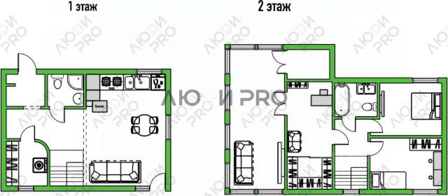На первом этаже дома просторная прихожая с гардеробом, кухня, гостиная с камином и выходом на веранду и во двор, санузел, гараж.