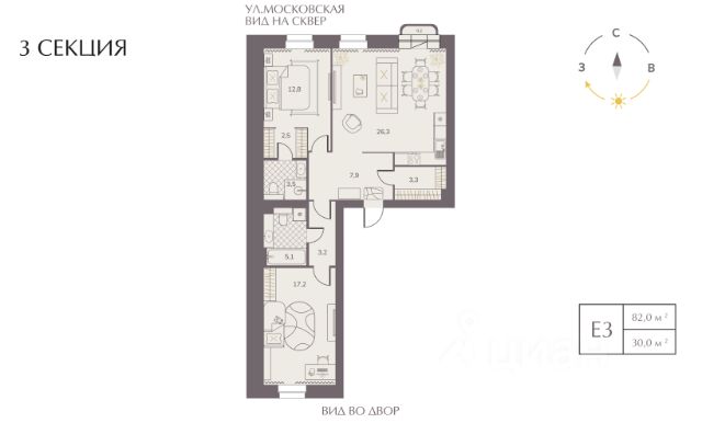 Окна кухни и комнаты площадью 8,3 м² выходят на Северо-запад. Окна комнаты площадью 17,6 м² выходят на Юго-запад.