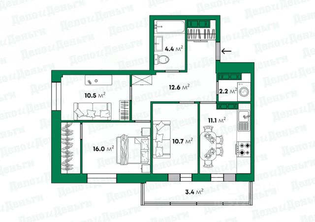 Планиpoвкa квартиры предполагает: кухня - гостиная - 29,2 м2, (кухонная зона - 11,8 м2, гостиная - 17,4 м2) с выходом на остекленный балкон, спальня. - 10,9 м2, детская 13,3 м2, санузел раздельный, просторная прихожая 13,2 м2.
