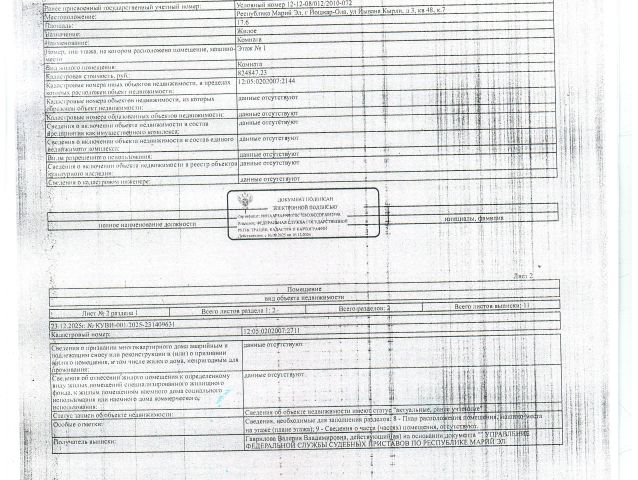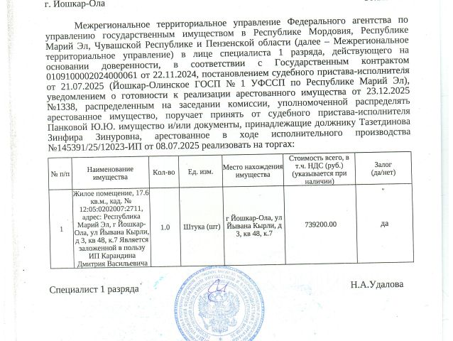 Данные получены с сайта ГИС Торги. Жилое помещение, пл. 17,6 кв.м., кад. 12:05:0202007:2711, адр.: РМЭ, г. Йошкар-Ола, ул Йывана Кырли, д 3, кв. 48, ком.7, должник Тазетдинова З.З. (орг-ор торгов сведениями о зарег-х в жилом помещении лицах/ информацией о задолженности должника по взносам на кап. ремонт не располагает (судебным приставом-исполнителем не предоставлены). Является заложенным в пользу ИП Карандина Д. В.