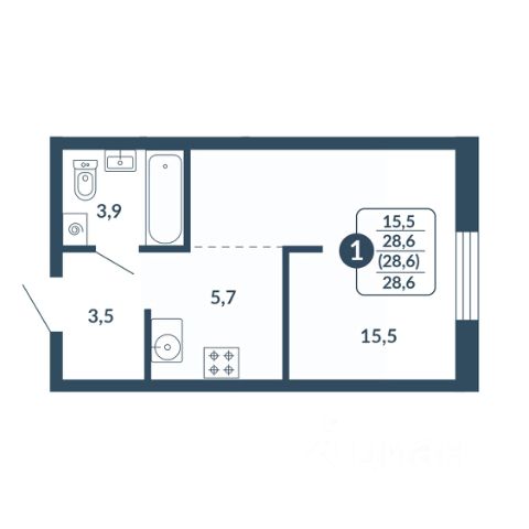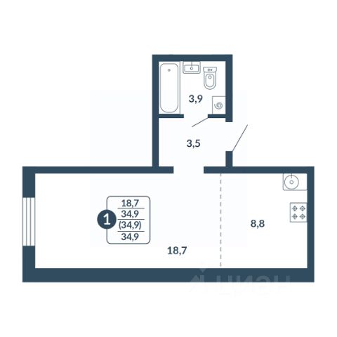 Студия составляет 19.2 м², из которых: 4 м² - ванная комната, санузел; и 15.2 м² - основная площадь (прихожая, гардеробная часть, кухонная зона, спальное расположение, офисный уголок и свободная центральная часть).
