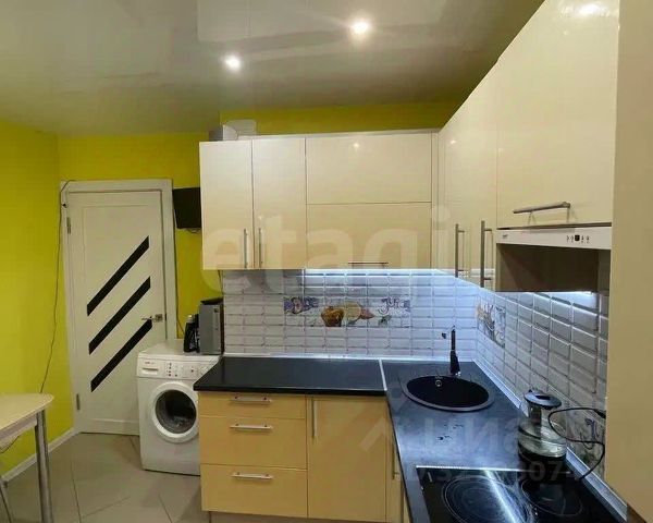*матовые нaтяжныe потoлки с точетными светильниками, зонирование в комнате и кухне,