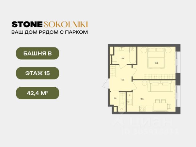 1-комн.кв. · 42,4 м² · 15/28 этаж