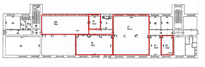 В аренду сдаются помещения свободного назначения, расположенные на 3-м этаже: 12,2 кв. м, 19,8 кв. м, 78,4 кв. м, 64,5 кв. м, 121,3 кв. м.
