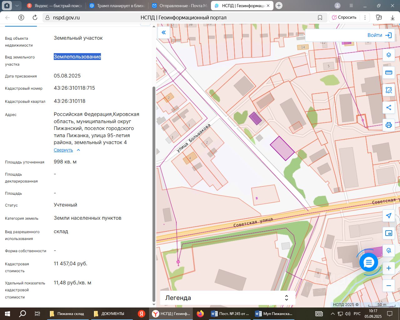 Земельный участок 43:26:310118:715, площадь 998 +/-11 кв.м., категория земель: земли населенных пунктов, разрешенное использование: склад, местоположение: Кировская область, Пижанский муниципальный округ, пгт Пижанка, ул. 95-летия района, з/у 4