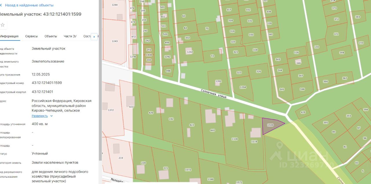 Земельный участок с кадастровым номером 43:12:121401:1599 Площадь земельного участка - 400 кв.м. Разрешенное использование - для ведения личного подсобного хозяйства (приусадебный земельный участок). Категория земель - земли населенных пунктов. Местоположение - Кировская область, Кирово-Чепецкий район, сельское поселение Федяковское, деревня Шутовщина, улица Солнечная, земельный участок 2