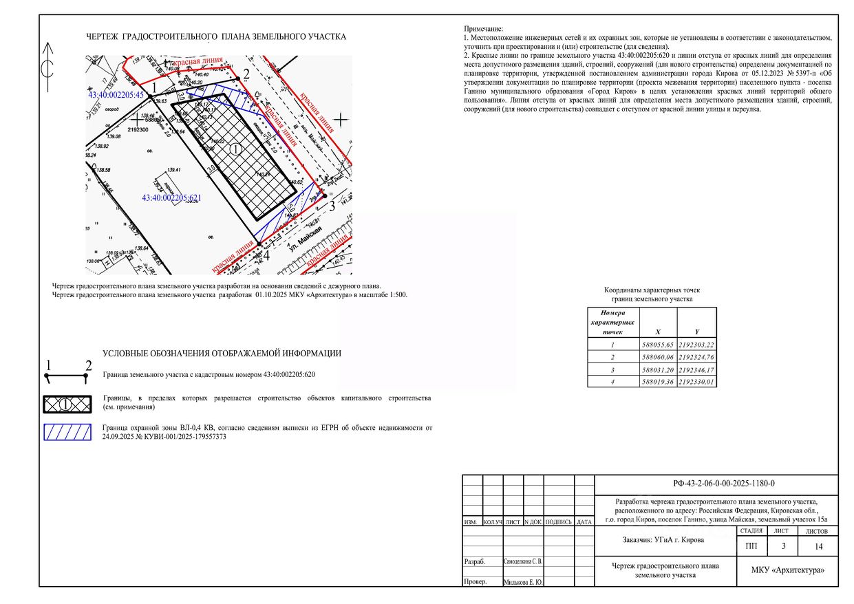 Земельный участок с кадастровым номером 43:40:002205:620. Адрес: Российская Федерация, Кировская область, городской округ город Киров, поселок Ганино, улица Майская, земельный участок 15а, категория земель земли населенных пунктов, вид разрешенного использования для индивидуального жилищного строительства, территориальная зона зона малоэтажной усадебной застройки сельского типа Ж-С, площадь - 810+/-1 кв.м.