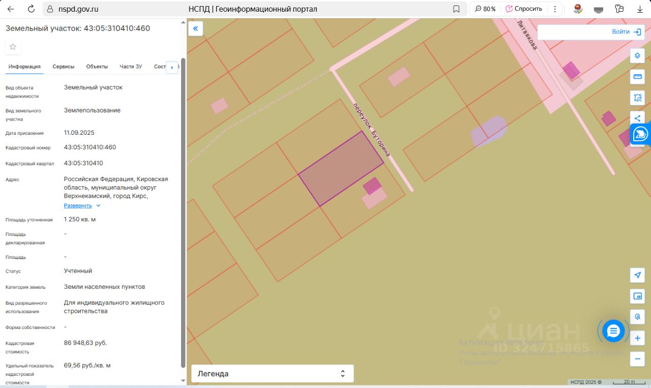 Земельный участок с кадастровым номером 43:05:310410:459 площадь 1250 кв.м. по адресу Российская Федерация, Кировская область, муниципальный округ Верхнекамский, город Кирс, переулок Буторина, земельный участок 6
