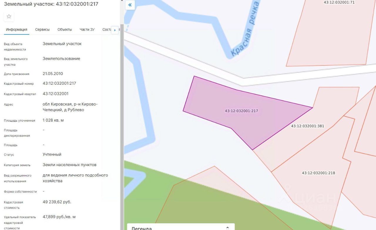 Земельный участок с кадастровым номером 43:12:032001:217.. Площадь земельного участка - 1028 кв.м. Разрешенное использование -для ведения личного подсобного хозяйства. Категория земель - земли населенных пунктов. Местоположение - Кировская область, Кирово-Чепецкий район, д. Рублево