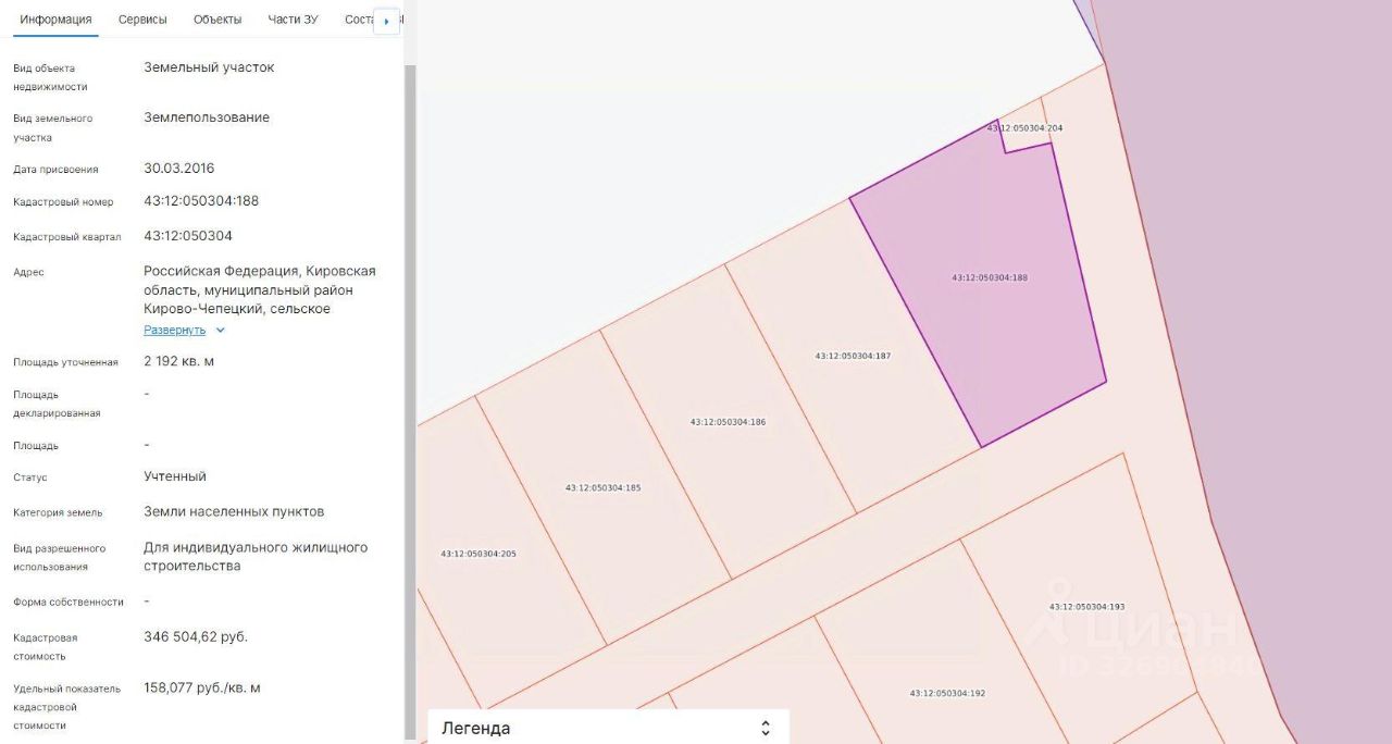 Земельный участок с кадастровым номером 43:12:050304:188. Площадь земельного участка - 2192 кв.м. Разрешенное использование -для индивидуального жилищного строительства. Категория земель - земли населенных пунктов. Местоположение - Кировская область, Кирово-Чепецкий район, село Бурмакино, улица Вятская, земельный участок 1.