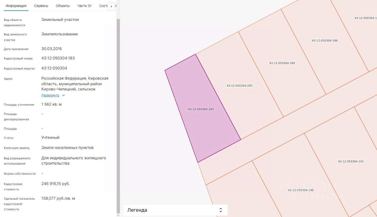 Земельный участок с кадастровым номером 43:12:050304:183. Площадь земельного участка - 1562 кв.м. Разрешенное использование -для индивидуального жилищного строительства. Категория земель - земли населенных пунктов. Местоположение - Кировская область, Кирово-Чепецкий район, село Бурмакино, улица Вятская, земельный участок 11.