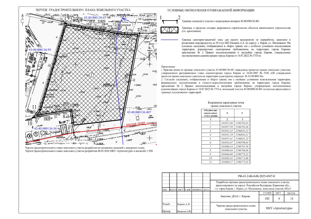 Земельный участок с кадастровым номером 43:40:000136:481. Адрес: Российская Федерация, Кировская область, г.о. город Киров, город Киров, ул. Московская, з/у 102а/1, категория земель - земли населенных пунктов, вид разрешенного использования пищевая промышленность, территориальная зона зона производственно-коммунальных объектов IV-V классов опасности ПК-4, площадь 3555+/-21 кв.м.