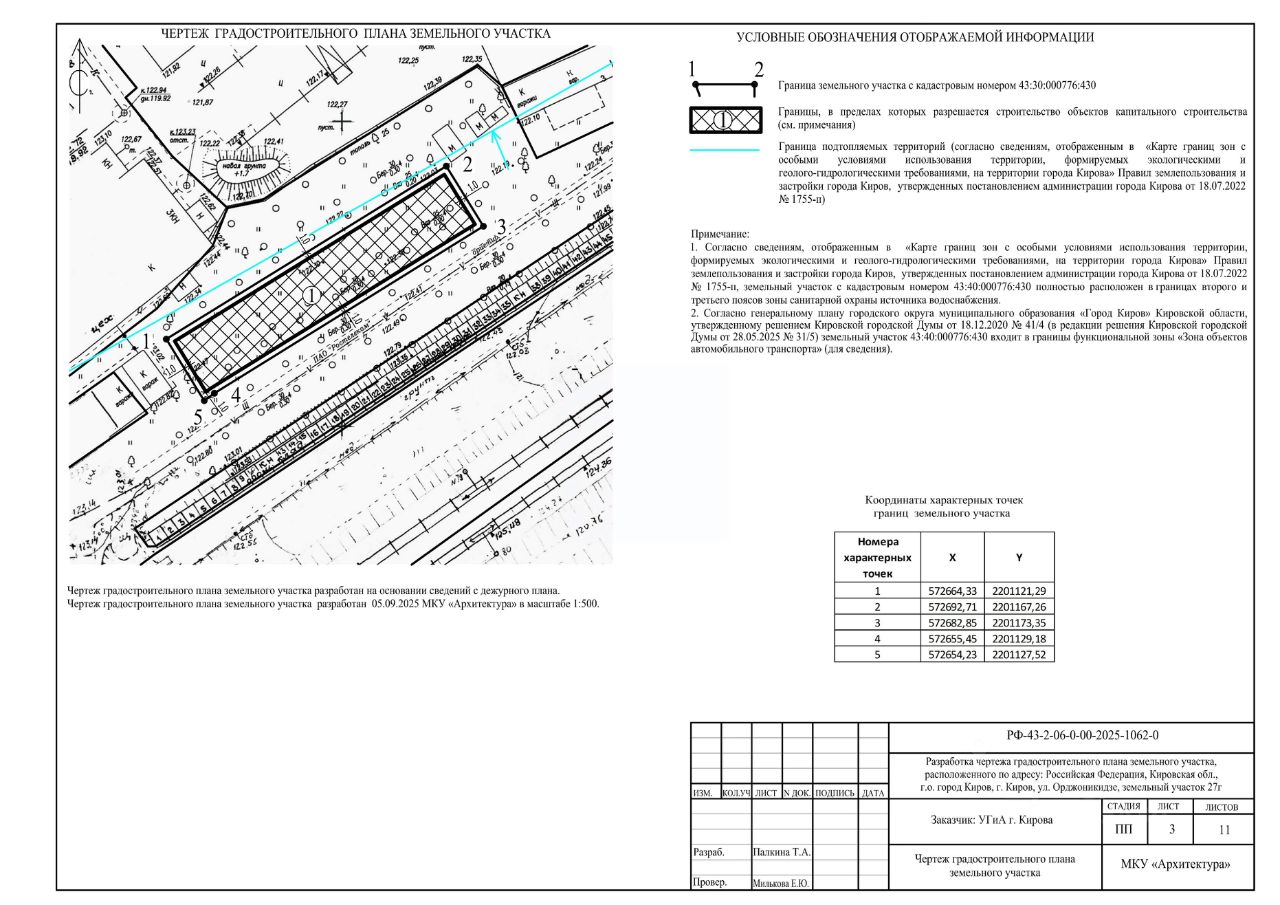Земельный участок с кадастровым номером 43:40:000776:430. Адрес: Российская Федерация, Кировская обл., г.о. город Киров, г. Киров, ул. Орджоникидзе (Нововятский), з/у 27 г, категория земель - земли населенных пунктов, вид разрешенного использования хранение автотранспорта, территориальная зона зона коммунальных объектов ПК-7, площадь 629+/-1 кв. метр.