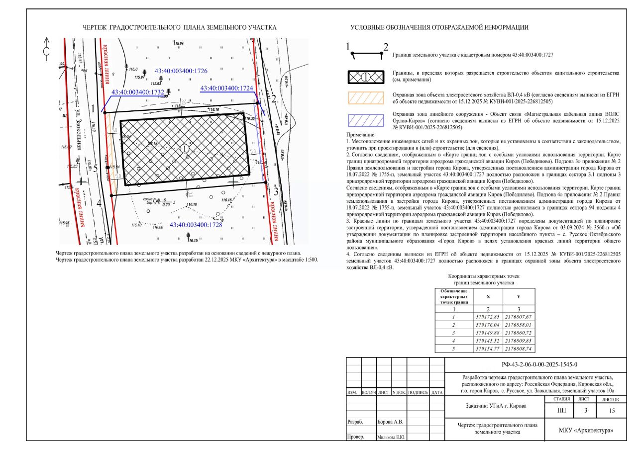 Земельный участок с кадастровым номером 43:40:003400:1727. Адрес: Российская Федерация, Кировская область, г.о. город Киров, с. Русское, ул. Заокольная, земельный участок 10а, категория земель земли населенных пунктов, вид разрешенного использования для индивидуального жилищного строительства, территориальная зона зона малоэтажной усадебной застройки сельского типа (Ж-С), площадь 1368 +/- 1 кв.м.