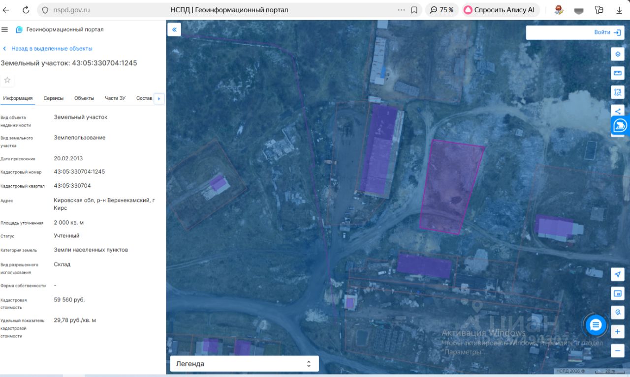Земельный участок с кадастровым номером 43:05:330704:1245 площадь 2000 по адресу Кировская обл, р-н Верхнекамский, г Кирс