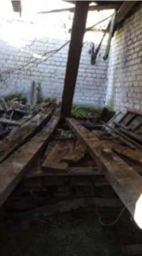 Этажность здания: 1. Год постройки: 1986. Описание конструктивных элементов: Материал строения: Наружные и внутренние стены: кирпичные. Фундамент: бутобетонные ленточные. Перекрытие: деревянное отепленное, оштукатуренное. Кровля: асбестоцементные листы по деревянным стропилам и обрешетке. Полы: цементно-песчаная стяжка Проемы: ворота деревянные филенчатые. Отделочные работы: окраска, побелка, штукатурка