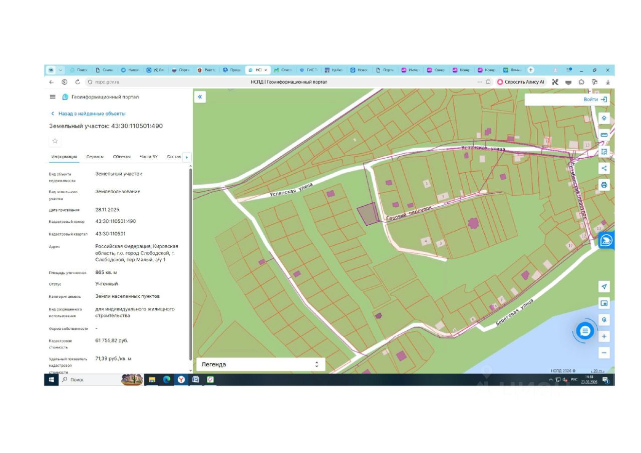 Земельный участок с кадастровым номером 43:30:110501:490 площадь 865 по адресу Российская Федерация, Кировская область, г.о. город Слободской, г. Слободской, пер Малый, з/у 1