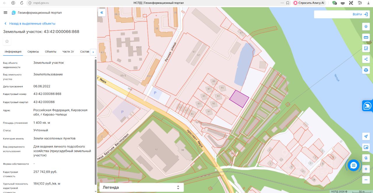 Земельный участок с кадастровым номером 43:42:000066:868, Адрес: Российская Федерация, Кировская область, г. Кирово-Чепецк. Общая площадь 1400 +/- 13 кв.м. Категория земель: земли населенных пунктов.