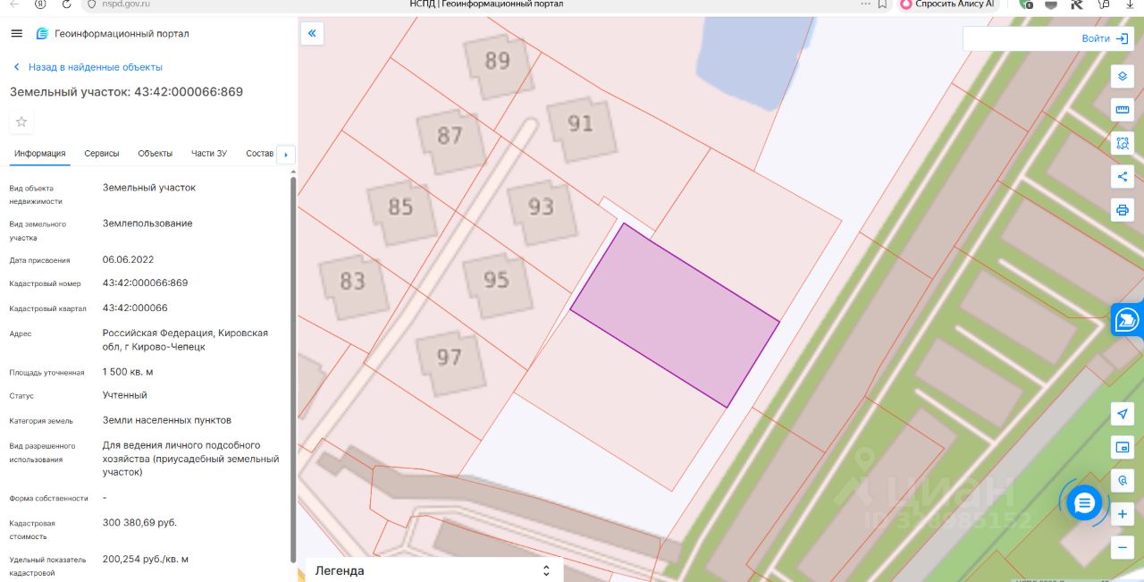 Земельный участок с кадастровым номером 43:42:000066:869, Адрес: Российская Федерация, Кировская область, г. Кирово-Чепецк. Общая площадь 1500 +/- 14 кв.м. Категория земель: земли населенных пунктов.