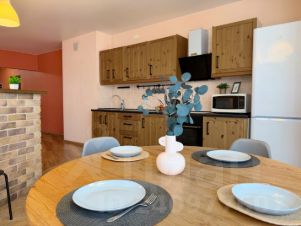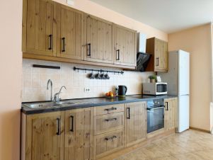 • Оборудованная кухня со всем необходимым - варочная панель, духовой шкаф, микроволновая печь, вытяжка, эл.чайник, набор посуды для приготовления пищи (сковорода, кастрюли, а также приборы), посуда на 6 персон и столовые приборы.
