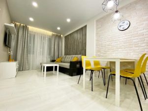 Спальня и гостиная: двуспальная кровать с ортопедическим матрасом, кабельное ТВ, двуспальный диван, Wi-Fi интернет, набор подушек 70х70 и одеял, утюг, гладильная доска, сушилка для белья, фен и стиральная машина.