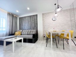 Спальня-гостиная: двуспальная кровать с ортопедическим матрасом, кабельное ТВ, 2 двуспальных дивана, Wi-Fi интернет, набор подушек 70х70 и одеял, утюг, гладильная доска, сушилка для белья, фен и стиральная машина.
