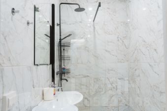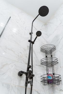 Современная ванная,зеркало, водонагреватель, душ, биде.