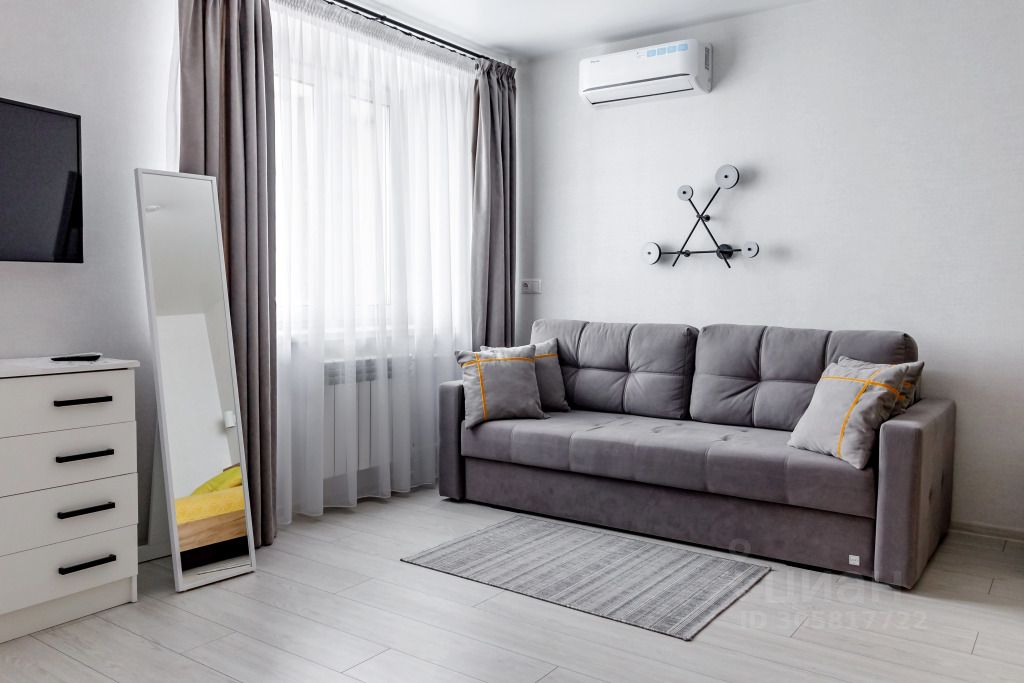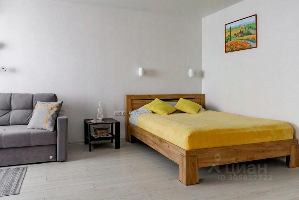 Квартира-студия подходит для семейного отдыха, командировочных и деловых поездок, а также для гостей, приезжающих на лечение. Квартира вмещает до 4 гостей: двуспальная кровать king-size с ортопедическим матрасом средней жёсткости и подушками, раскладной диван на двоих.