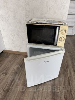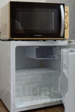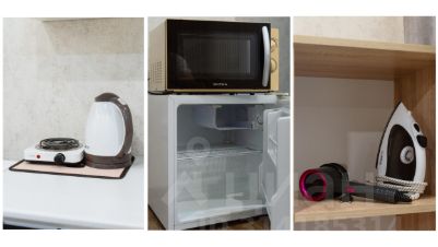 Холодильник, микроволновая печь, плитка, чайник, столовые приборы и посуда.