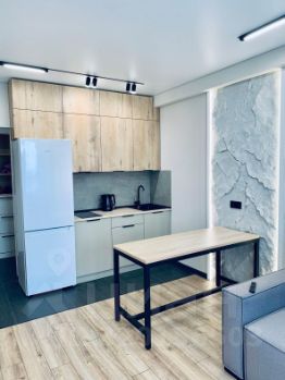 Гардероб, санузел совмещен, душевая кабина, стиральная машина, холодильник, встроенная кухня и мебель.