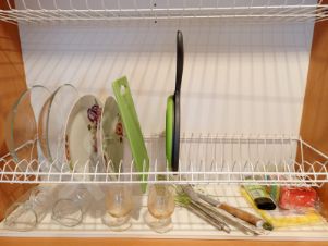 Имеется набор посуды для приготовления и приема пищи, средства личной гигиены.