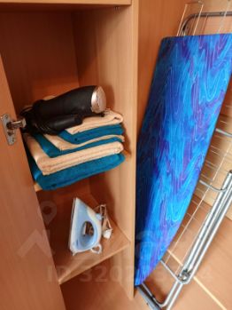 Техника: стиральная машина, холодильник, индукционная плита, микроволновая печь ,фен, утюг, электрочайник, телевизор, гладильная доска, сушильная доска.