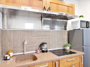 Оборудованная кухня со всем необходимым - варочная панель, микроволновая печь, эл. Чайник, набор посуды для приготовления пищи (сковорода, кастрюли, а также приборы), посуда на 4 персоны и столовые приборы.