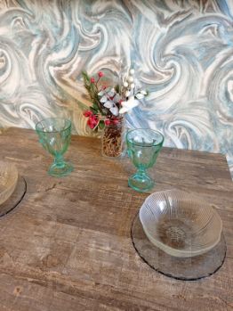 Имеется набор посуды для приготовления и приема пищи, средства личной гигиены.