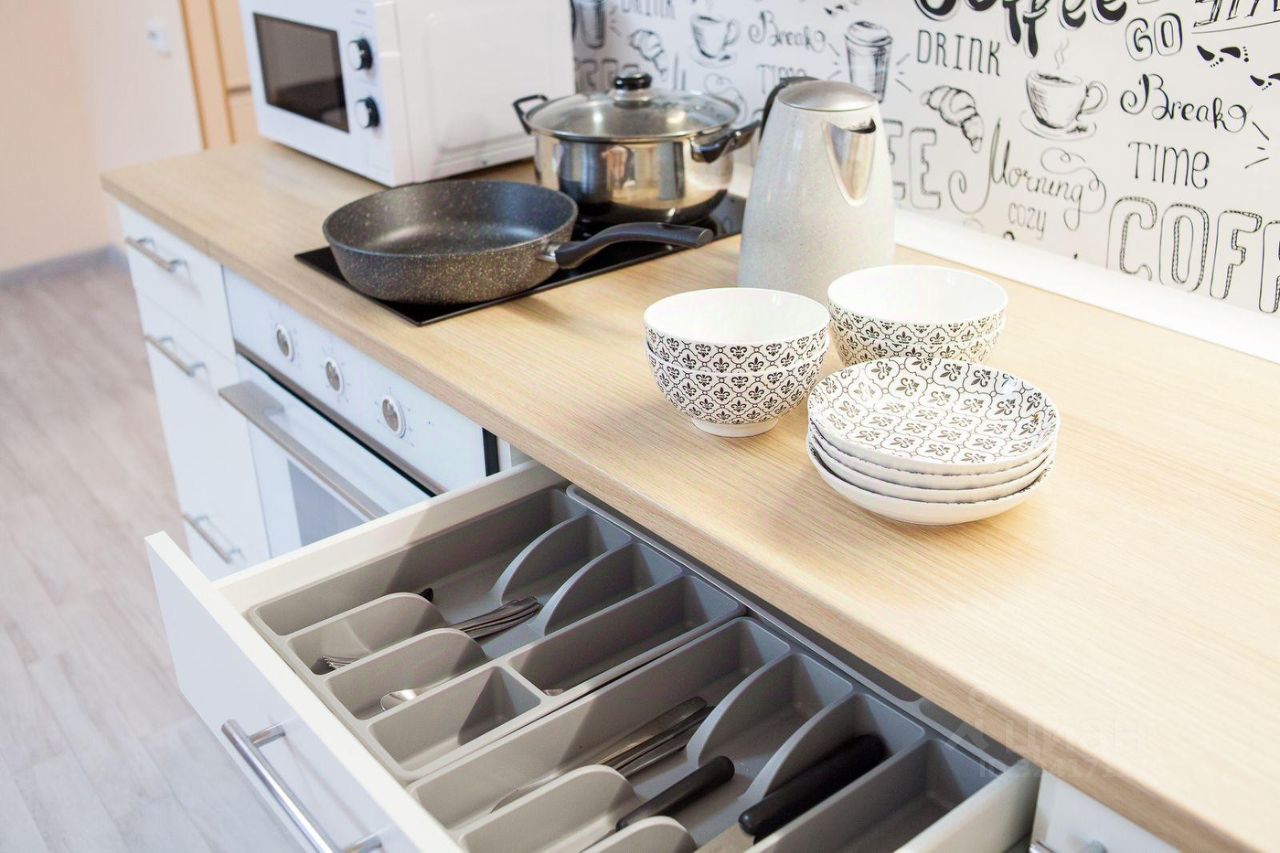 В апартаментах есть всё необходимое для проживания гостей: комфортабельные спальные места, вся техника и мебель, оборудована кухонная зона.