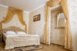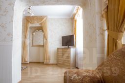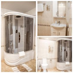 Оснащение: одежный шкаф и багажная тумба в прихожей, мини-холодильник, чайная пара, чайник, большой раскладной диван, журнальный столик, телефон, телевизор в гостиной; двуспальная кровать и прикроватные тумбочки в спальне; раковина, зеркало, гигиенические средства, унитаз, душевая кабина, махровые халаты и тапочки, набор полотенец в ванной комнате.
