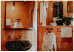 Оснащение: одежный шкаф или вешалка с тумбой в прихожей, мини-холодильник, чайная пара, чайник, обеденный стол и стулья, телефон, телевизор, кондиционер, двуспальная кровать в комнате; раковина, зеркало, гигиенические средства, унитаз, душевая кабина, халаты и тапочки, фен, набор полотенец в ванной комнате.