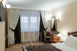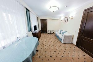 Трехкомнатный (семейный) люкс превосходно подходит для проживания семьи из 4-х человек. Классический дизайн, современная мебель, сочетание сдержанных цветов также делает номер привлекательным для респектабельной публики. Полноценная реализация пространства номера дает возможность в полной мере расслабиться и отдохнуть. Номер состоит из гостиной, спальни, кабинета и ванной комнаты.
