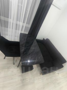 Кухня-гостинная: черный удобный диван с подставкой для ног (при необходимости раскладывается для гостей 2 места), большой раскладной обеденный стол, 2 поворотных стула.